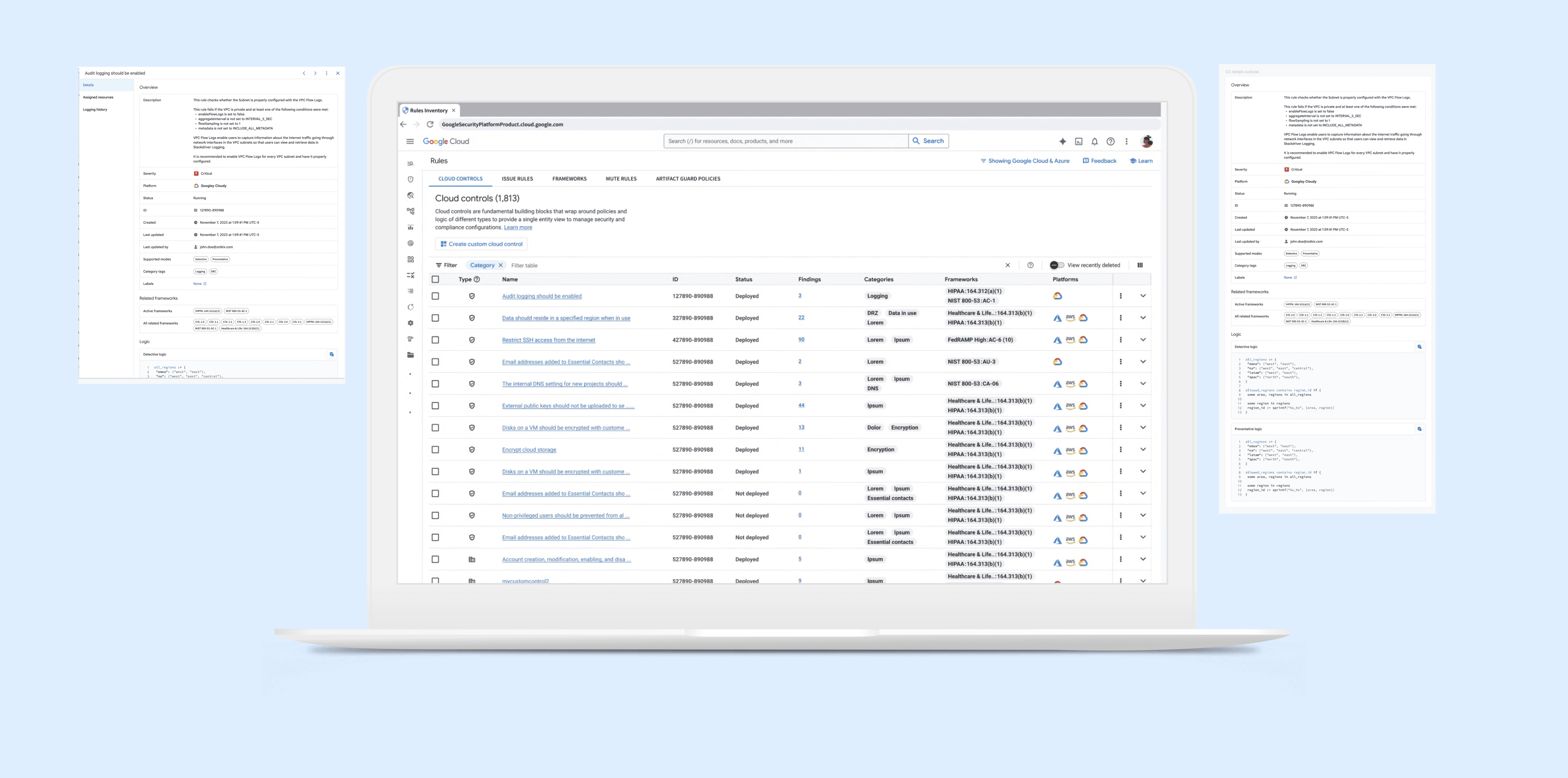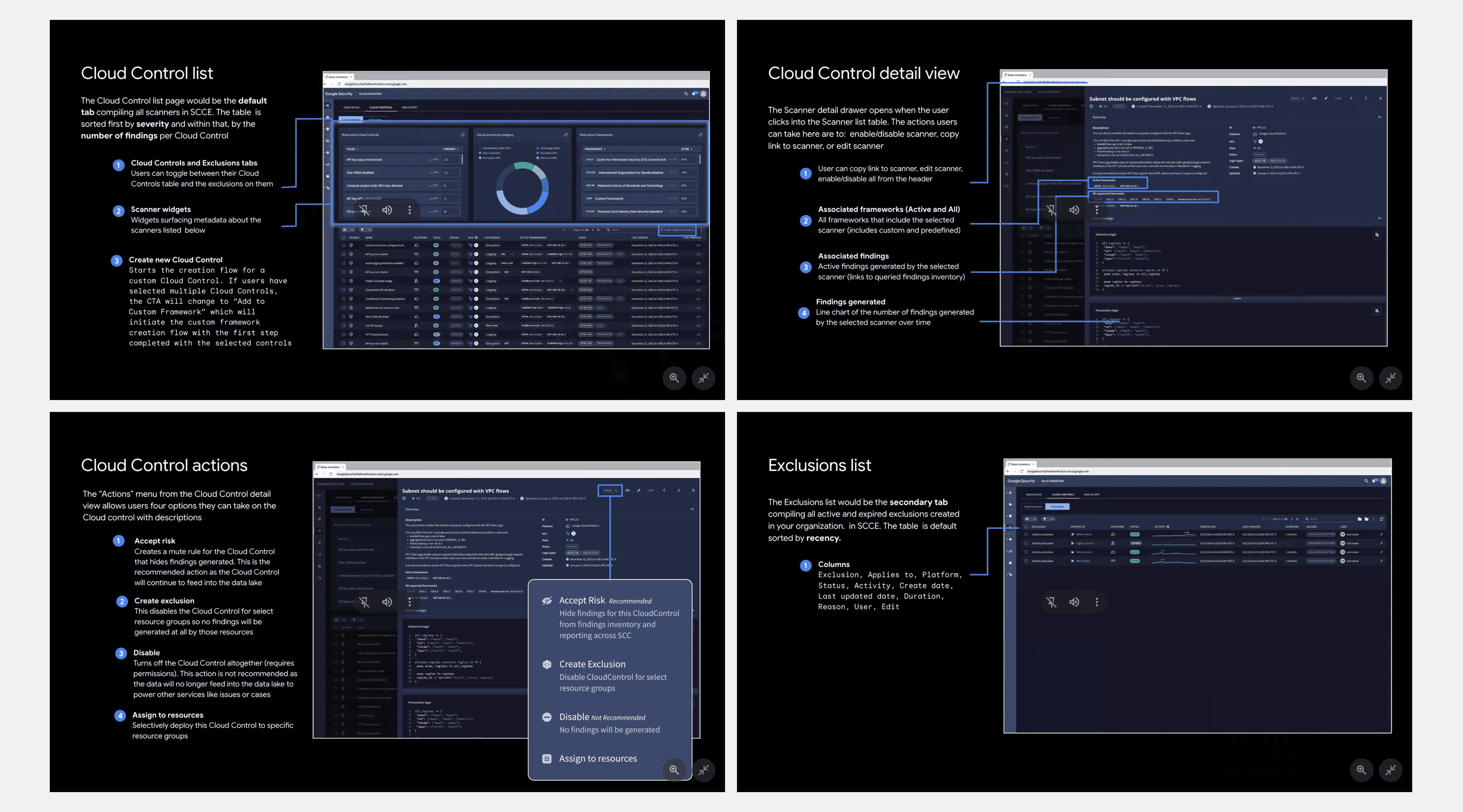 "Security practitioners should have peace of mind that SCC is comprehensively scanning everything they want to cover, and looking for the right things. Not only should it be possible to view the full inventory of detective cloud configuration rules, but the user should be able to see the logic of any rule, duplicate it, edit it to meet their needs, then track violations of that rule as part of a custom Framework." - UX Vision Doc