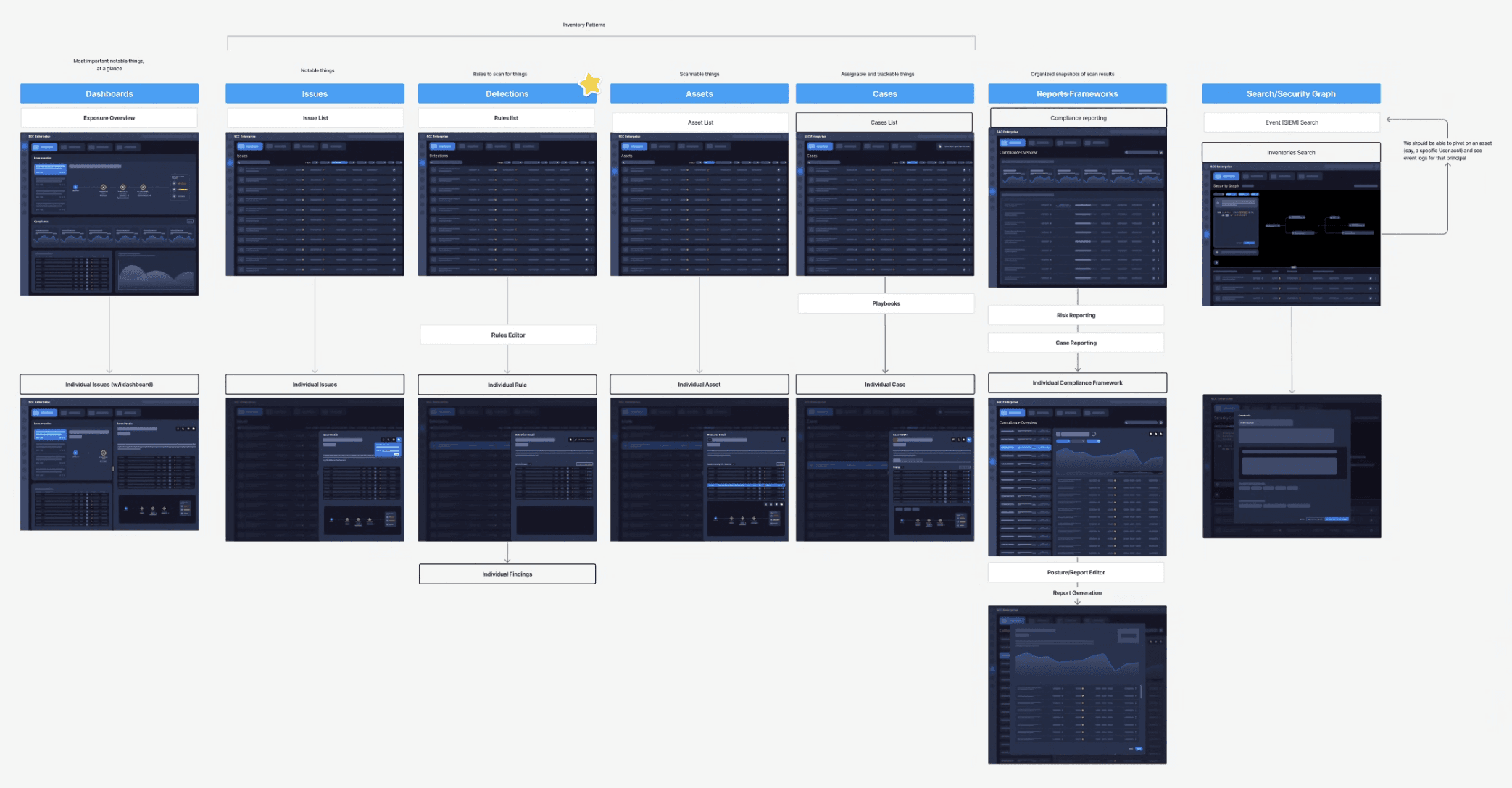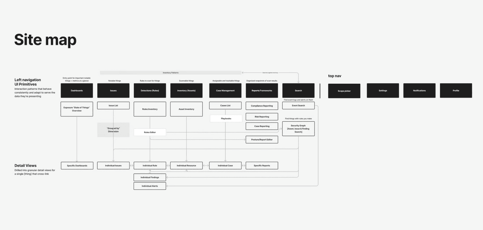 To prevent a further fragmented rules management experience for users, I defined the product vision for a centralized Rules Inventory. My proposal was a single destination where users could view, configure, and manage all of their generative rules types across SCC. I sketched out a site map of a unified rules ecosystem where the primary job to be done was configuration. The goal was to provide visibility into what each rule powered and how it impacted the environment.