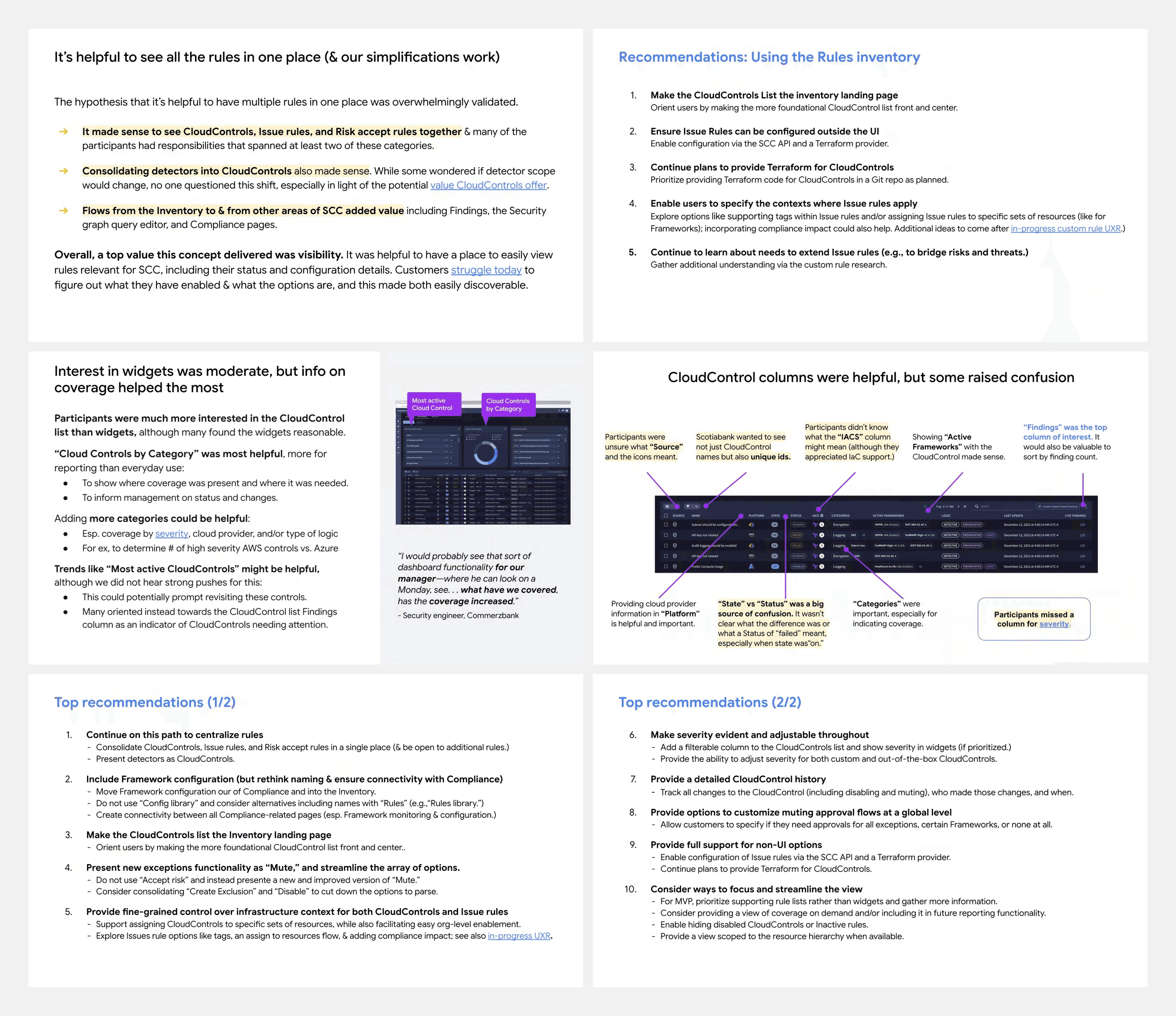 UX identified a gap in the existing experience for how Security Command Center (SCC) surfaced the generative rules powering its detection capabilities. These rules governed everything users could see and interact with, but they were not transparently accessible or modifiable. To make matters worse, we were developing new rule types with configuration management that was entirely separate from existing rules. A classic case of “shipping our org chart”.
